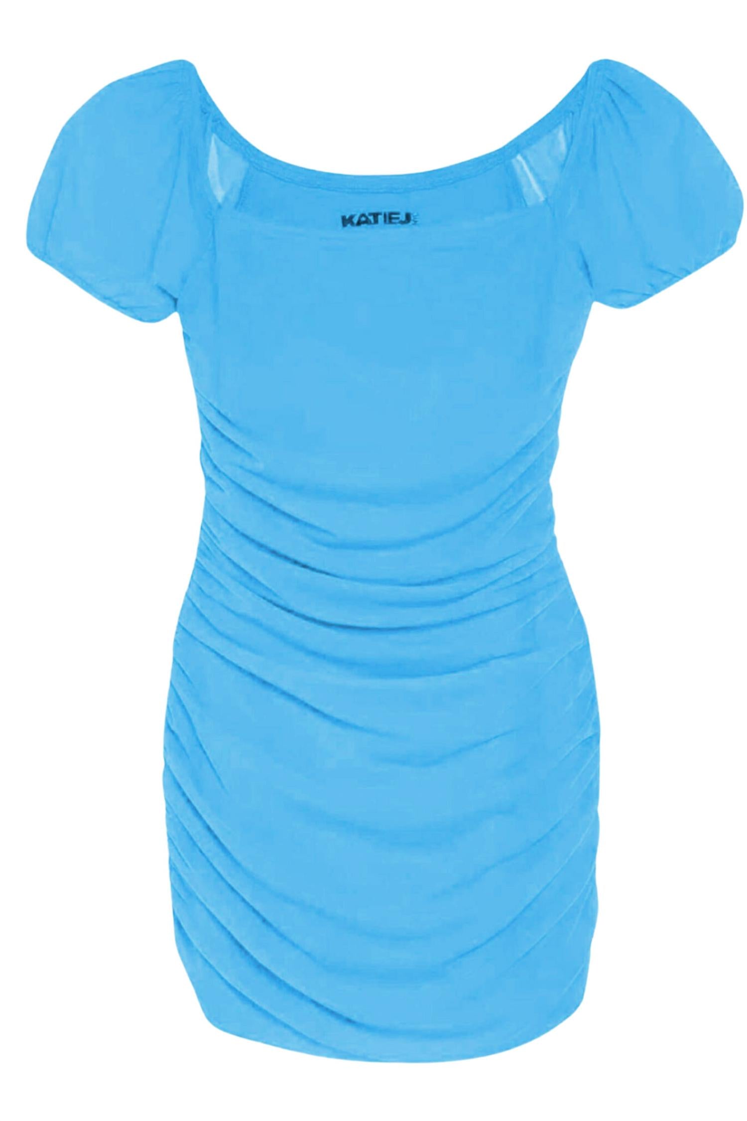 Malha leve com franzidos por toda a peça. Mangas bufantes. Decote quadrado.