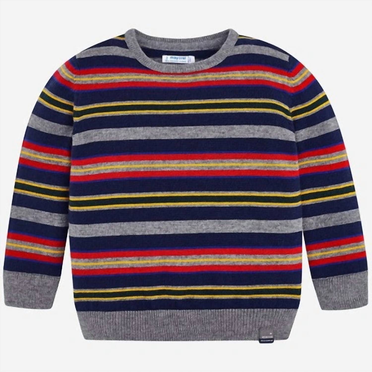 Introducing the Boy's Color Stripe Sweater by Mayoral, a stylish addition for the back-to-school season with a nod to '90s fashion. This knit sweater features a versatile crewneck, long sleeves, and is detailed with ribbed cuffs and hem for a polished finish. Its multi-color stripe pattern adds a playful yet timeless touch, perfect for the Fall season. Ideal for boys, this sweater blends comfort and style effortlessly.