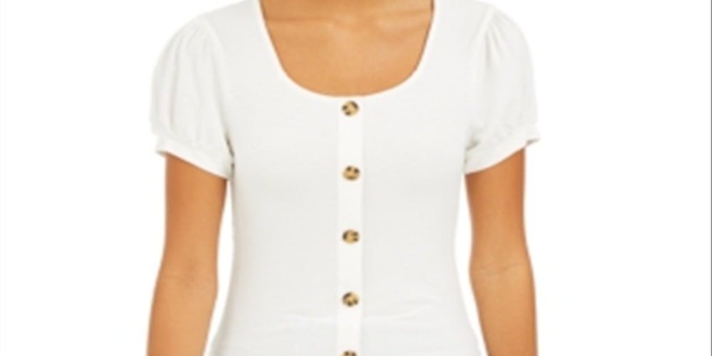 Decote redondo | Botões decorativos na frente; canelado em toda a peça | Mangas curtas bufantes