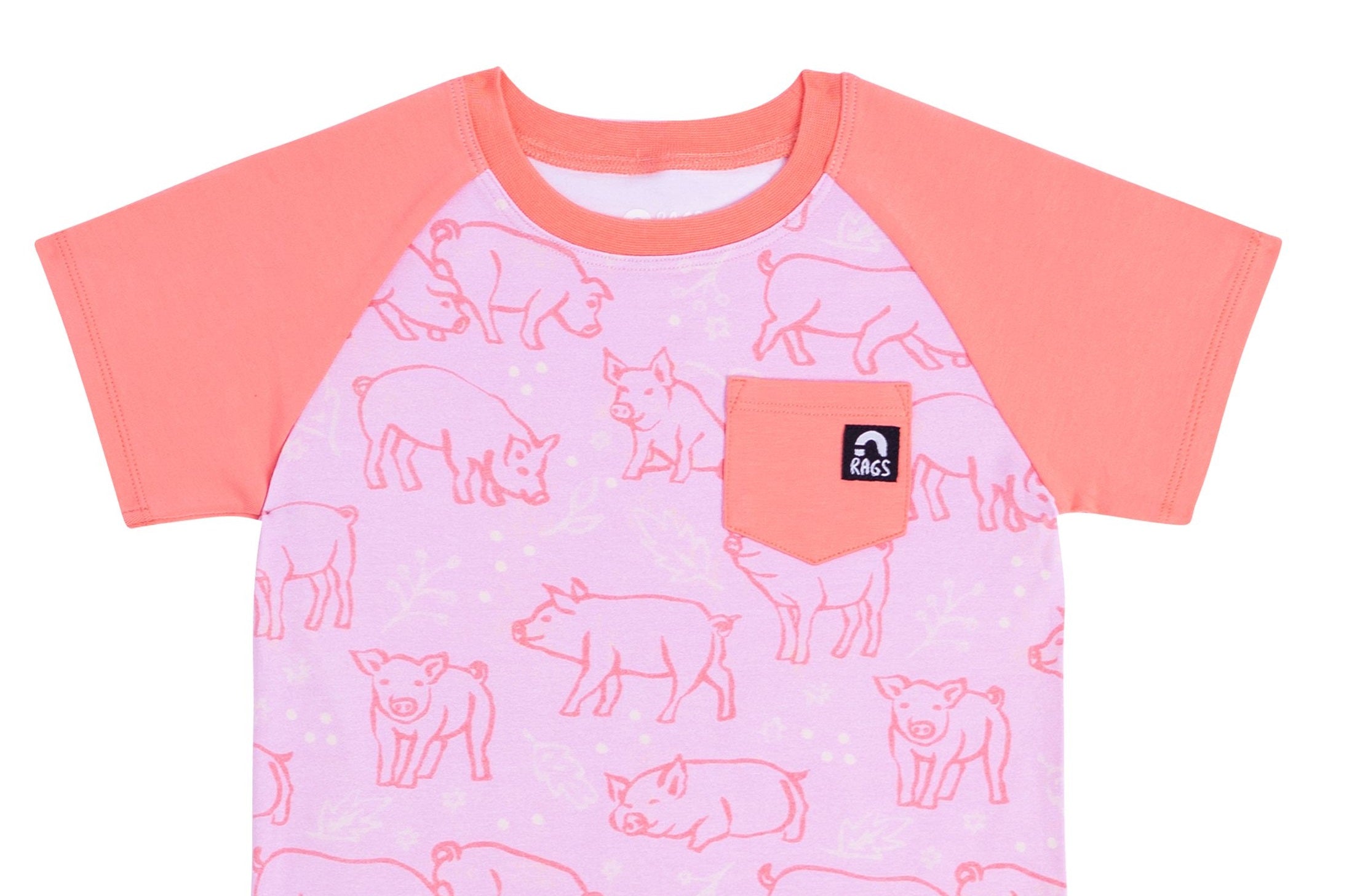Camiseta infantil RAGS Apparel manga curta raglan com bolso arredondado rosa tamanho 2T