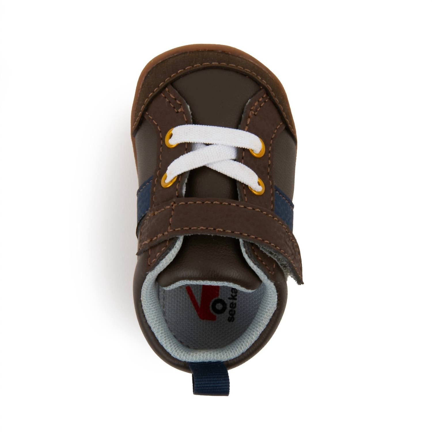 Conheça o Tênis Connor Mini First Walker da See Kai Run, uma escolha estilosa e funcional para os primeiros passos do seu pequeno. Projetado para meninos pequenos, este tênis apresenta cabedal em couro marrom com sobreposições em nobuck e bico arredondado protegido por uma biqueira de borracha extra durável. O solado de borracha TPR reciclada garante flexibilidade e tração, enquanto a tira ajustável de velcro com cadarços elásticos artificiais proporciona um ajuste seguro. Os cuidados são simples: basta limpar com detergente neutro e pano úmido, deixando secar naturalmente.