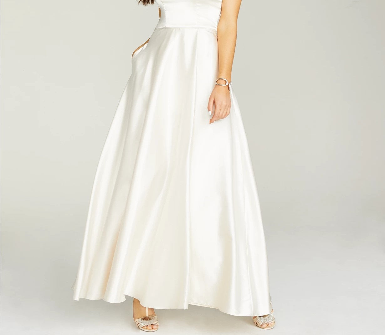 Aproximadamente 152 cm de comprimento, do centro do pescoço até a bainha. O comprimento é baseado no tamanho 5 e varia 1,5 cm entre os tamanhos. | Decote em V | Fecho de zíper nas costas | Alças cruzadas nas costas | Bolsos nas costuras; saia envelope falsa; fenda na altura da coxa na frente.
