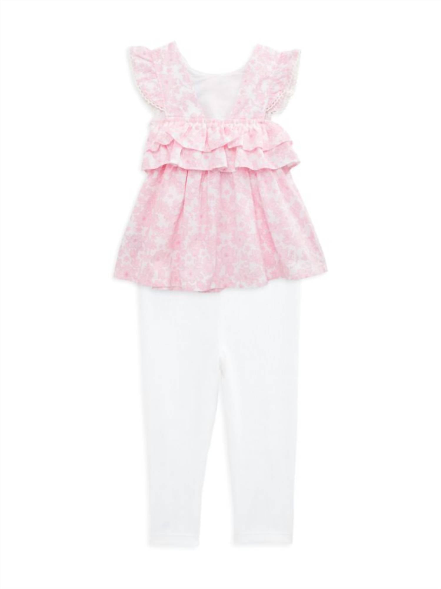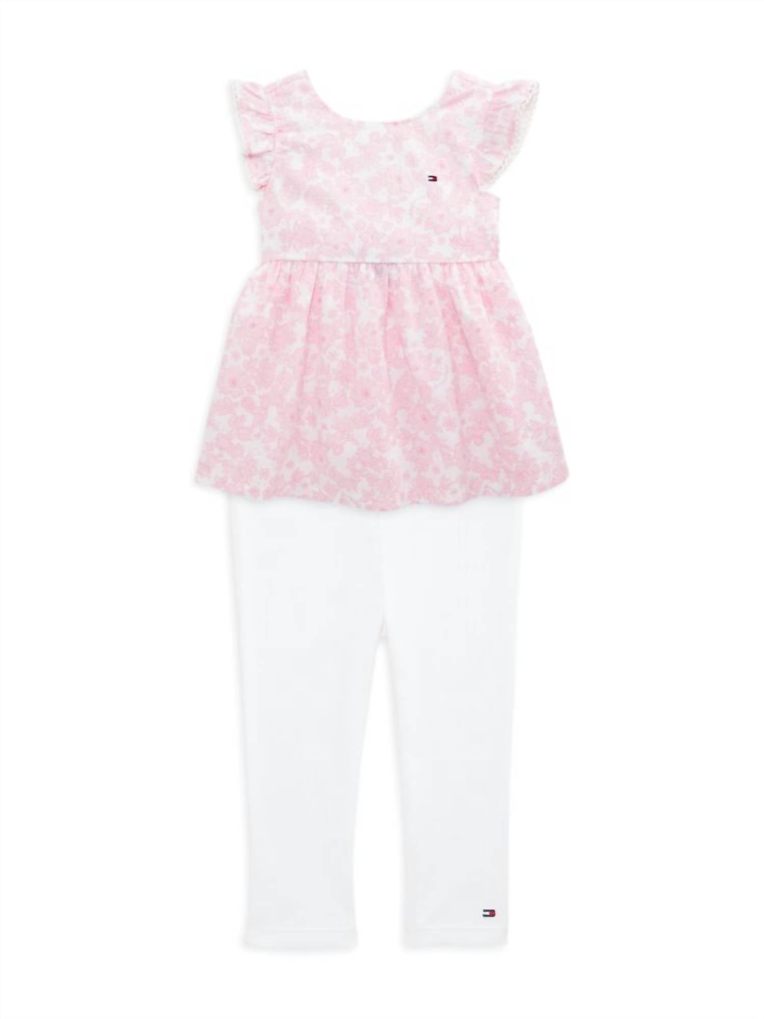 Eleve o guarda-roupa da sua filha com o conjunto Tommy Hilfiger de 2 peças de blusa floral e legging capri em cores sortidas. A blusa tem gola redonda e mangas curtas esvoaçantes, design plissado e babados, além de um prático estilo pulôver, confeccionado em algodão puro para maior conforto. A legging capri tem cintura marcada e estilo pull-on, confeccionada em uma mistura macia de algodão, poliéster e elastano para um acabamento canelado. Os cuidados são simples, com instruções de lavagem à máquina.
