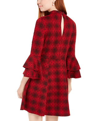 Vestido de malha xadrez com manga sino e corações de lantejoulas para jovens, tamanho grande, vermelho