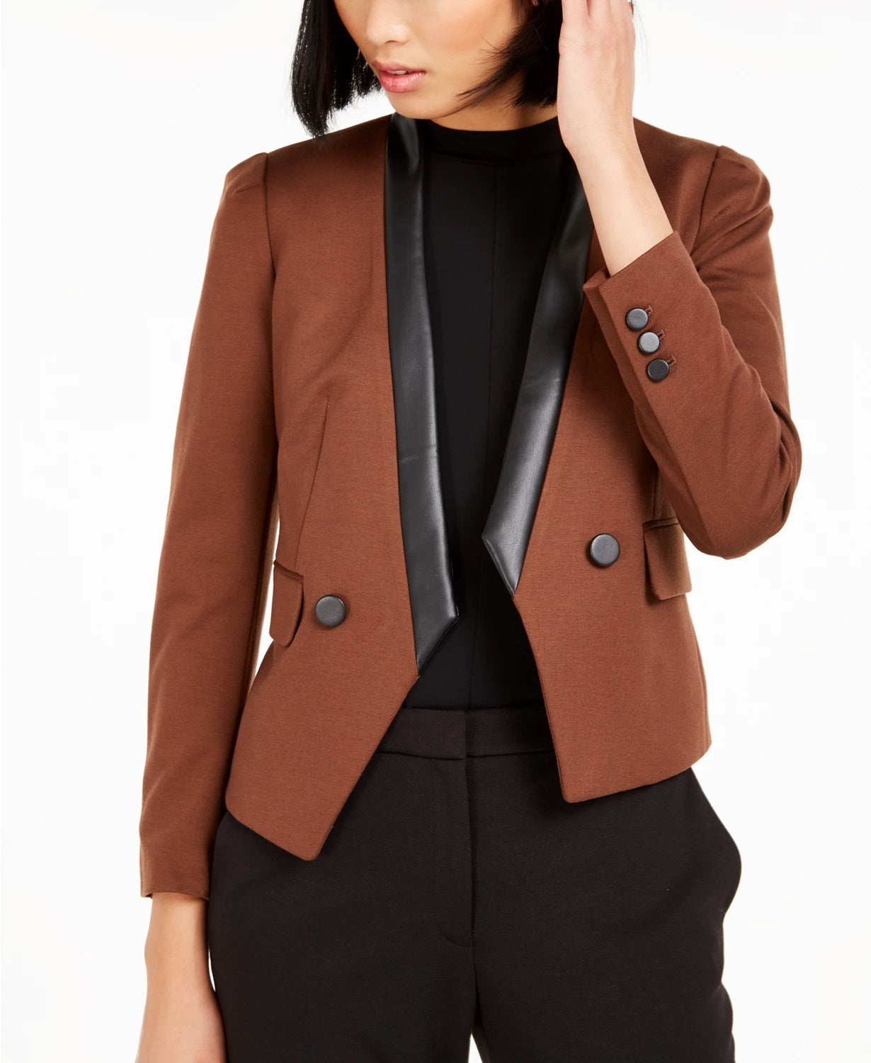 Aproximadamente 21" de comprimento | Sem gola; acabamento em couro sintético na frente aberta | Mangas 3/4 | Dois bolsos na cintura | Poliéster/viscose/elastano; acabamento: poliuretano; forro: poliéster