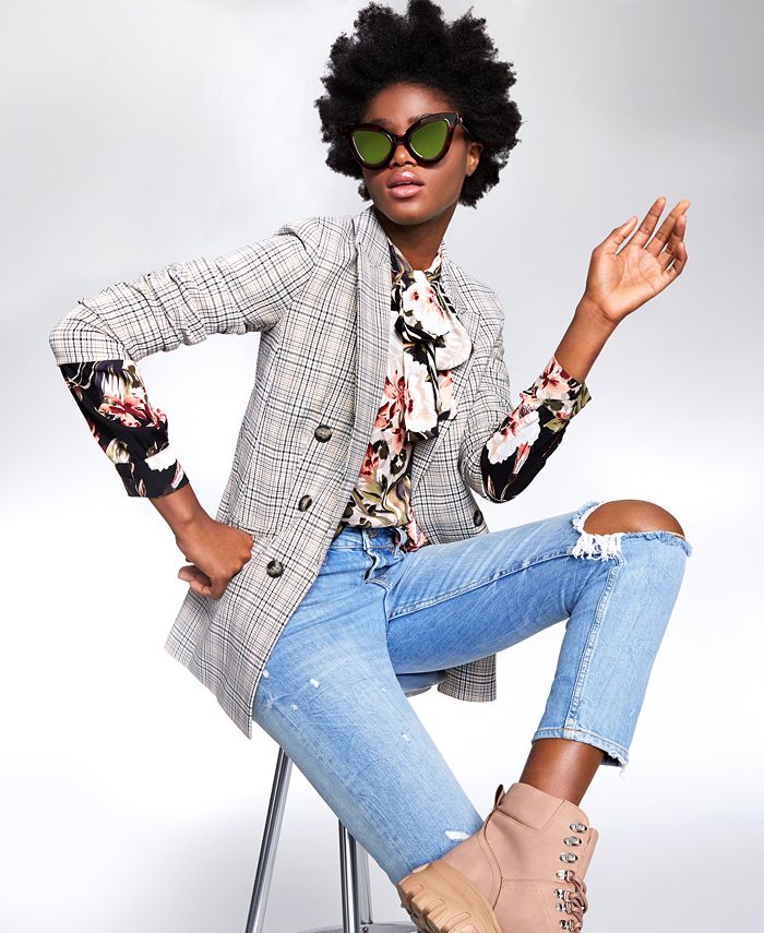 A frente aberta confere um estilo versátil a este blazer falso trespassado da Bar III | com estampa xadrez clássica e acabamento com lapelas pontudas. | Dois bolsos nos quadris | Forrado | Importado | Botões falsos trespassados na frente; ombreiras | Lapelas pontudas; frente aberta