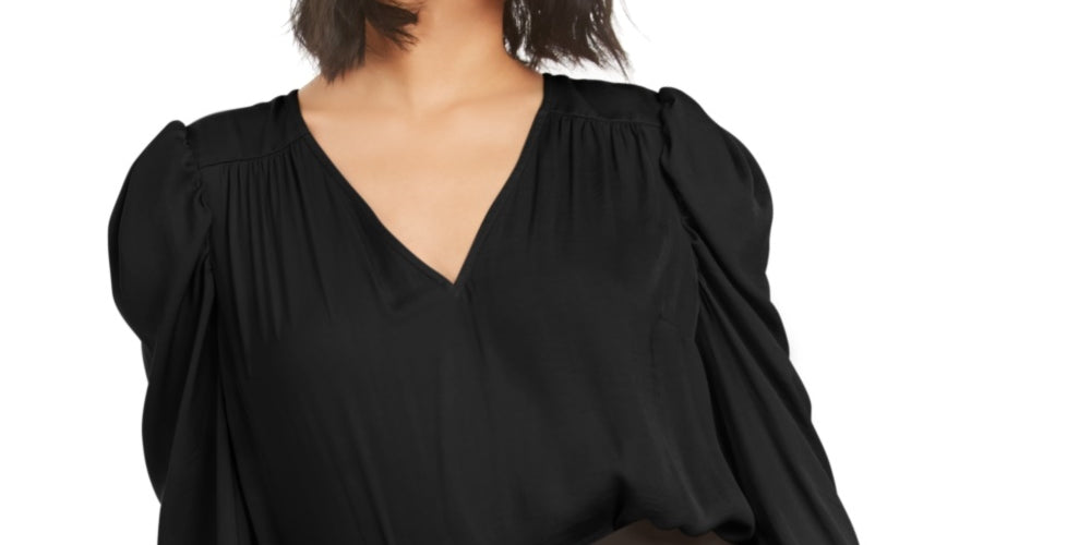 Ajuste fácil; aprox. 24-1/2 de comprimento | Decote em V; fecho de botão no centro do decote das costas | Pregas nos ombros | Mangas compridas com ombros bufantes e punhos elásticos