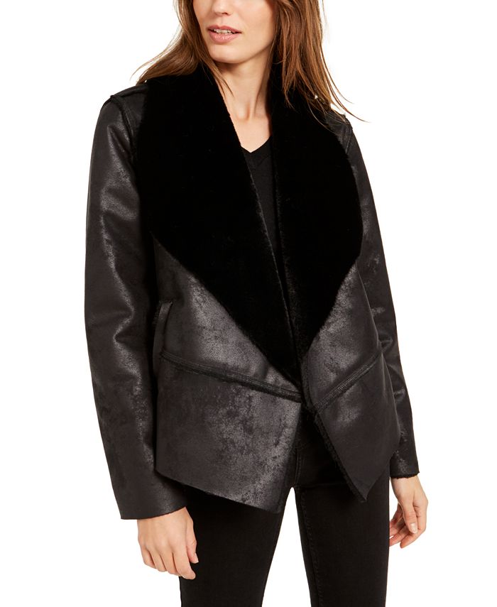 Vista-se com esta jaqueta de pele de carneiro sintética quente, aconchegante e moderna da Bar III | Aproximadamente 22-1/2 de comprimento do centro das costas até a bainha | Frente aberta drapeada com acabamento em pele de carneiro sintética | Detalhe de costura