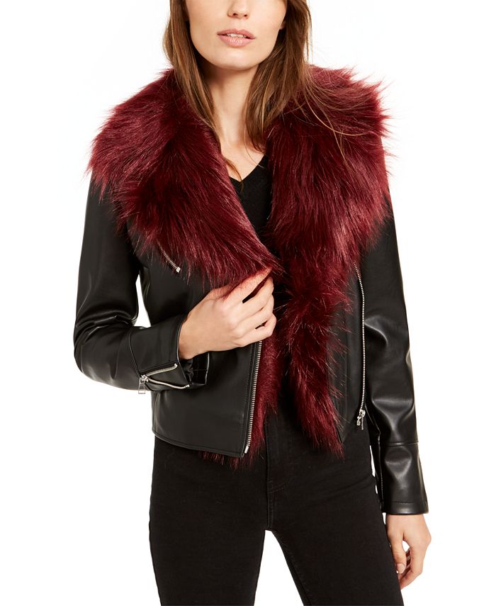 Borda motociclista com a atitude vibrante da pele sintética | A jaqueta de couro sintético da Bar III tem zíper na parte frontal lateral | bolsos e punhos. | Aproximadamente 18-/2 de comprimento do centro do pescoço até a bainha | Gola de pele sintética removível; fecho de zíper assimétrico na parte frontal lateral | Bolso inclinado com zíper no peito direito; bolso com aba no quadril direito; bolso vertical com zíper na parte frontal esquerda