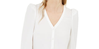 Blusa feminina Bar III lisa com manga 3/4 e decote em V, com botões, branca, tamanho médio