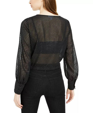 Blusa feminina Bar III com babados e bolinhas metálicas, manga comprida, preta, tamanho médio