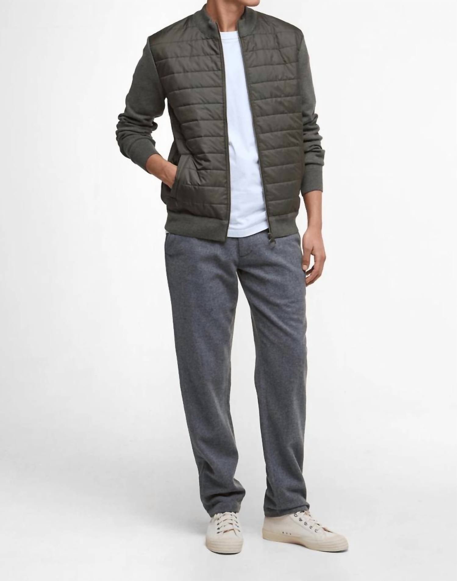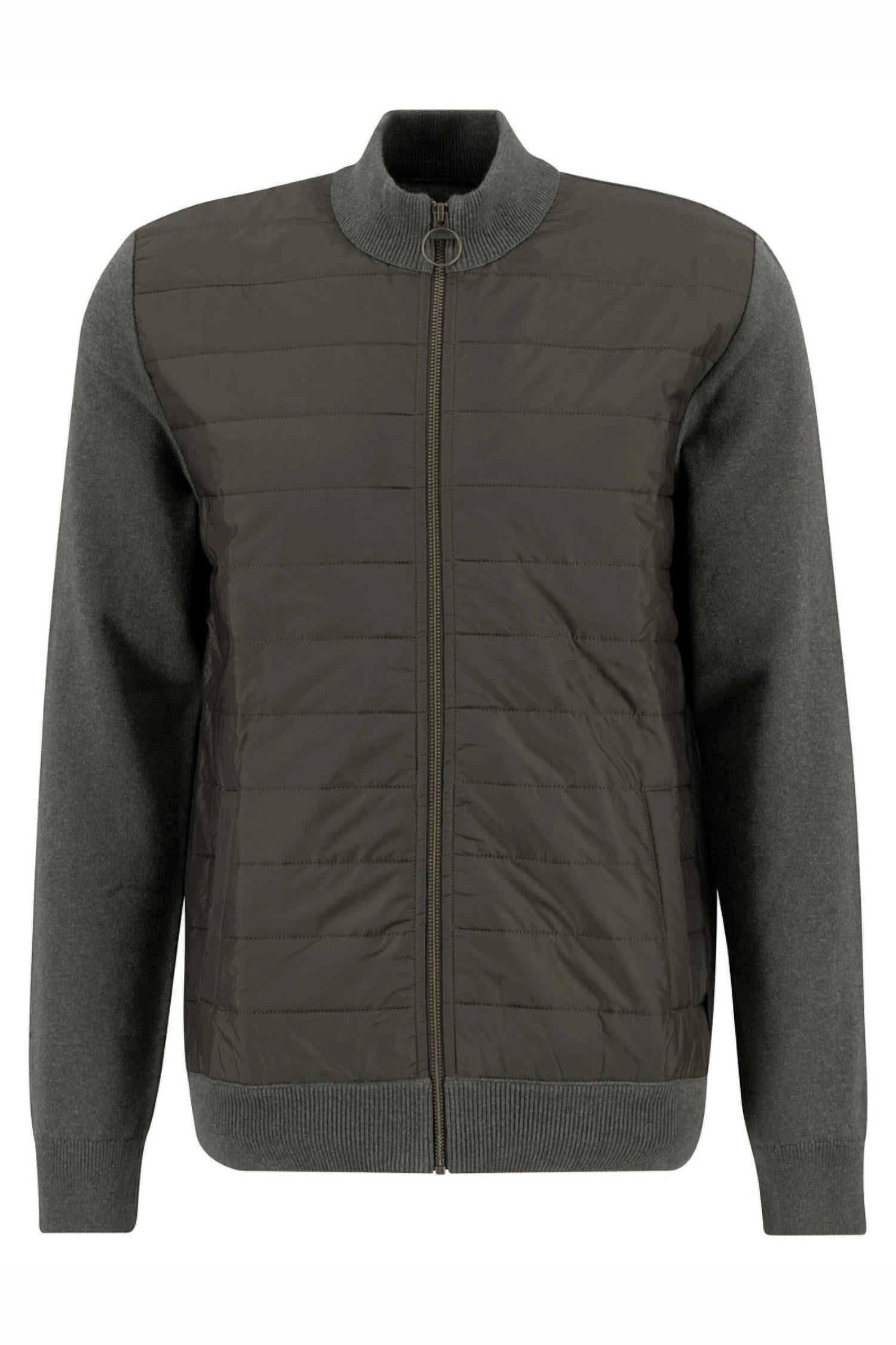 Introducing the Barbour Essential Carn Quilted Jumper, a stylish choice for the fall season in a rich olive hue. Crafted with long sleeves, this versatile layer features a composition of 100% cotton with a baffle-quilted front panel in technical polyamide fabric for extra insulation. Its streamlined design includes a zip closure leading to a smart stand collar, and practical welt pockets. Back length measures 26.6" to 28.9". Care: Machine wash at 30°C with a mild process for effortless maintenance.