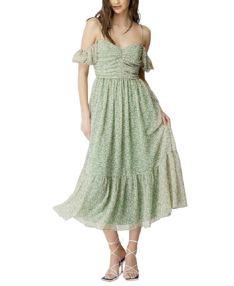 Lindo para encontros românticos ou comemorações de fim de semana | Este vestido Bardot apresenta uma estampa delicada e um design de ombros descobertos. | Aproximadamente 41-9/10 de comprimento do centro do pescoço até a bainha. O comprimento varia 1/4 entre os tamanhos | Decote coração; corte midi | Fechamento por zíper nas costas | Recortes nos ombros descobertos; detalhe franzido no corpete