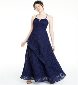 Vestido formal feminino BCX com alças finas e decote em V, comprimento total, estilo flare, azul, tamanho 1