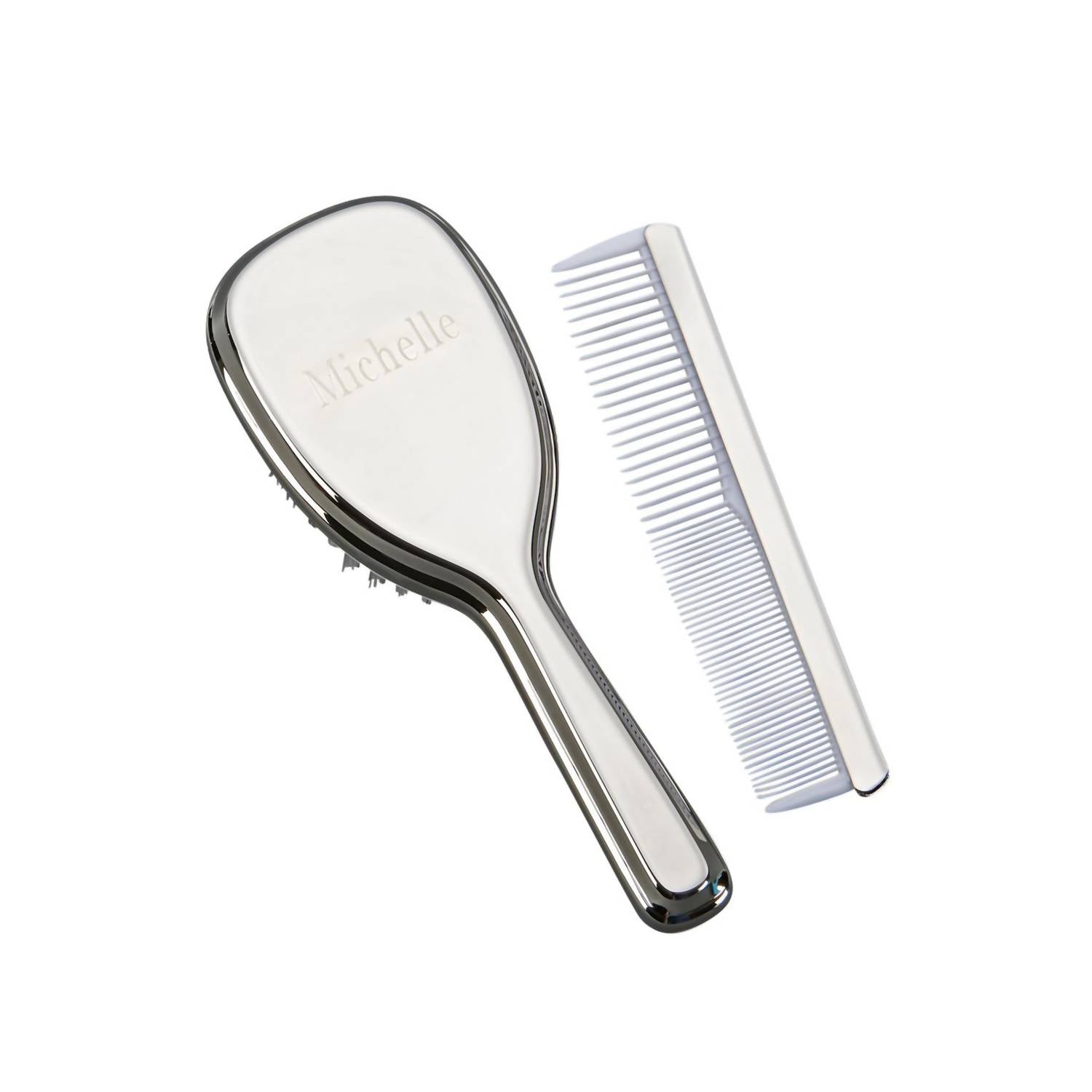 O conjunto é produzido em acabamento niquelado brilhante, antimanchas. O pente tem 12,5 cm de comprimento e "dentes" brancos. A escova tem um cabo elegante e mede 15 cm x 5,3 cm. Se você quiser adicionar uma gravação, a área ideal para gravação é de 7,6 cm x 6,3 cm, totalmente plana.