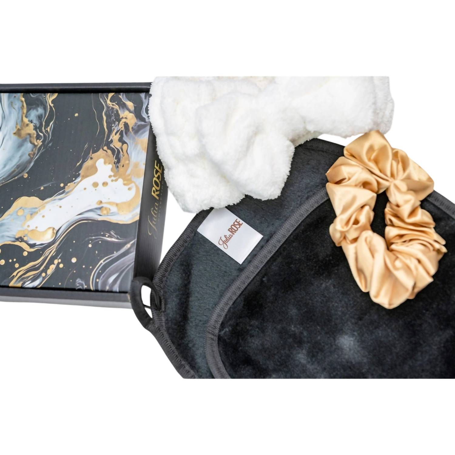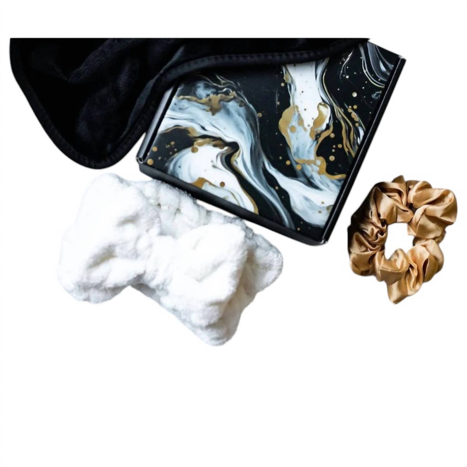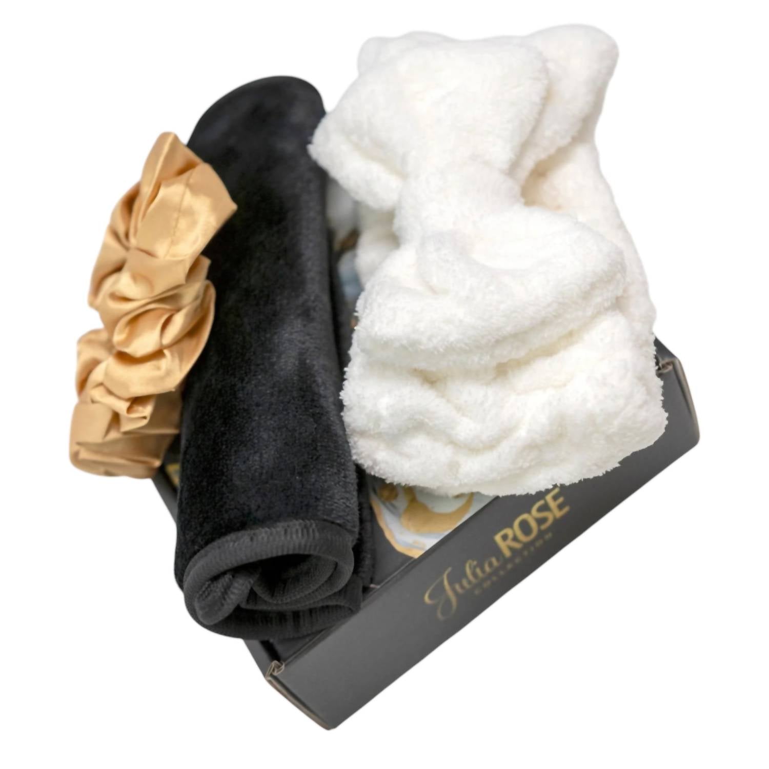 Este conjunto de presente inclui um lenço demaquilante, uma faixa de cabelo e um scrunchie, oferecendo uma mistura perfeita de relaxamento e frescor para sua rotina noturna.