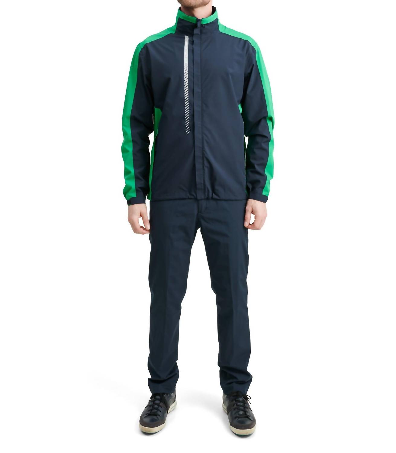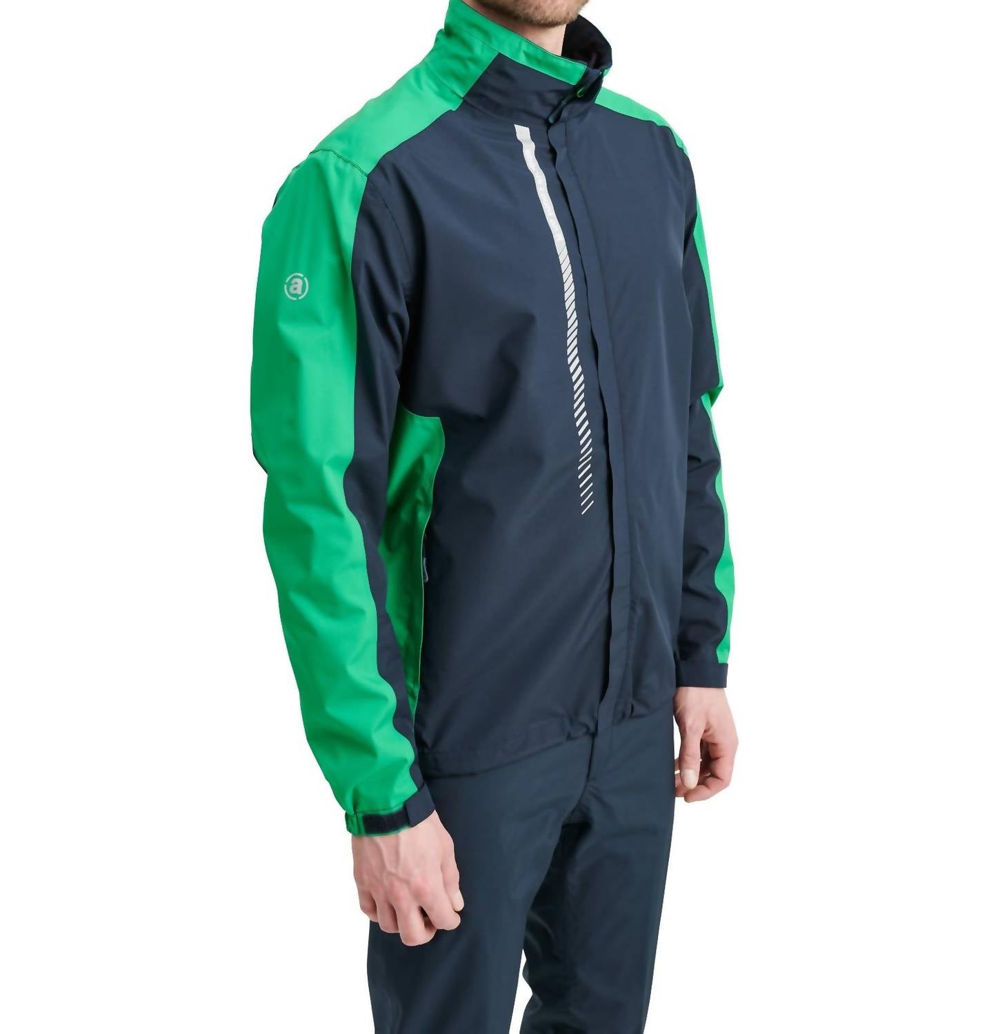 Introducing the Links Stretch Rain Jacket by Abacus Sportswear US, a game day essential in navy fairway designed for comfort and style. This lightweight jacket features long sleeves and is made from a 2-way stretch waterproof nylon fabric that is both breathable and PFC-free, ensuring a sustainable choice. With a zip closure, adjustable velcro cuffs, and drawstrings at the neck and hem, it allows for a customizable fit. Care: Machine wash and line dry for lasting performance.