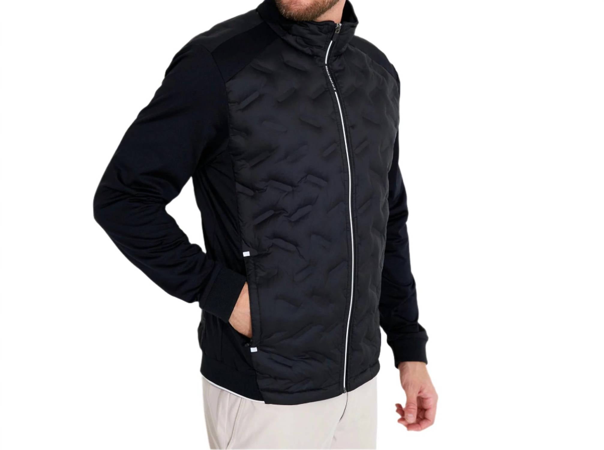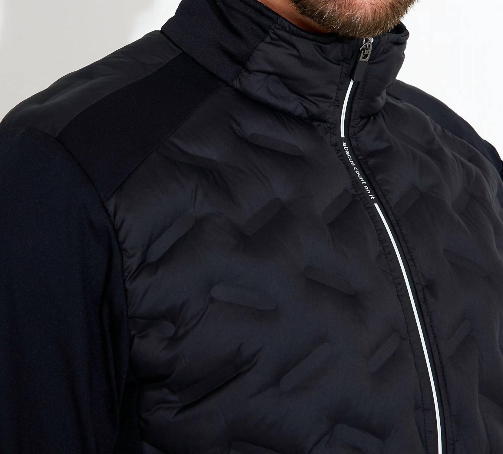 Introducing the Portrush Full Zip Hybrid Jacket by Abacus Sportswear US, a men's athleisure essential perfect for game day. This black jacket features long sleeves and is crafted from breathable fleece with a solid pattern. Designed with a mockneck and seamless quilted windproof panels, it ensures warmth and flexibility. Closure: Zip closure. Care: Machine wash and tumble dry.
