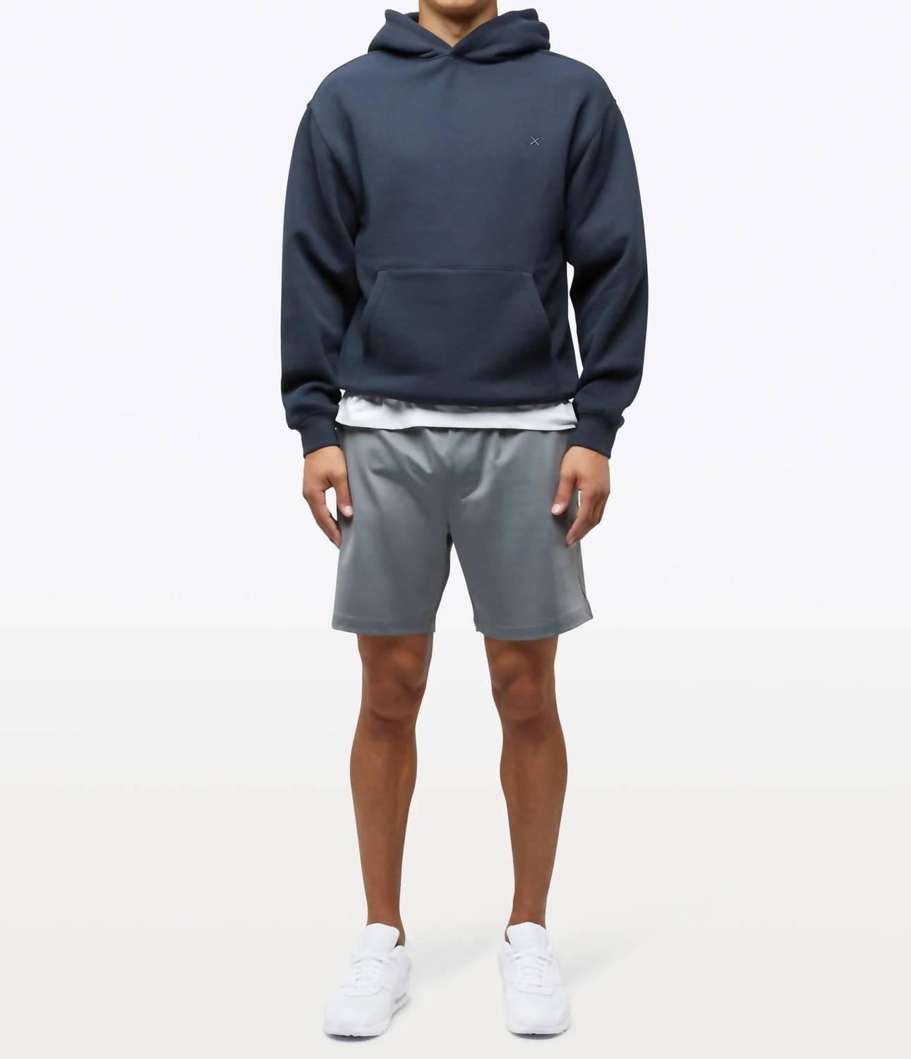 Presenting the Foundation Shorts by CUTS in Storm, a solid, versatile choice for the athleisure trend. These men's athletic shorts are crafted from 88% polyester and 12% spandex, offering a buttery-soft feel with 4-way stretch for maximum flexibility. Designed to sit right above the knee with an 8'' inseam, they feature an elastic waistband and drawstring closure for comfort and security. Equipped with practical pockets, including a back pocket with zipper and side seam front pockets, they are perfect for fitness or workout sessions. Care instructions include machine wash cold with like colors and lay flat to dry.
