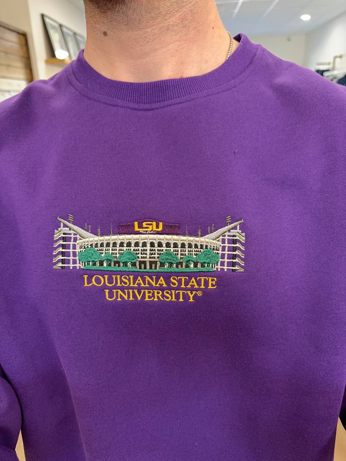 Introducing the LSU Crewneck Sweater by Traditions Collegiate Apparel in a striking purple hue. This vintage-inspired piece features long sleeves and is crafted from a comfortable 50% cotton, 50% polyester blend. It offers a pull-on closure for easy wear and showcases a solid minimalist pattern ideal for spring occasions. Care for this piece by machine washing and line drying for optimal longevity. Model is 5'11", 170 pounds, wearing a size large.