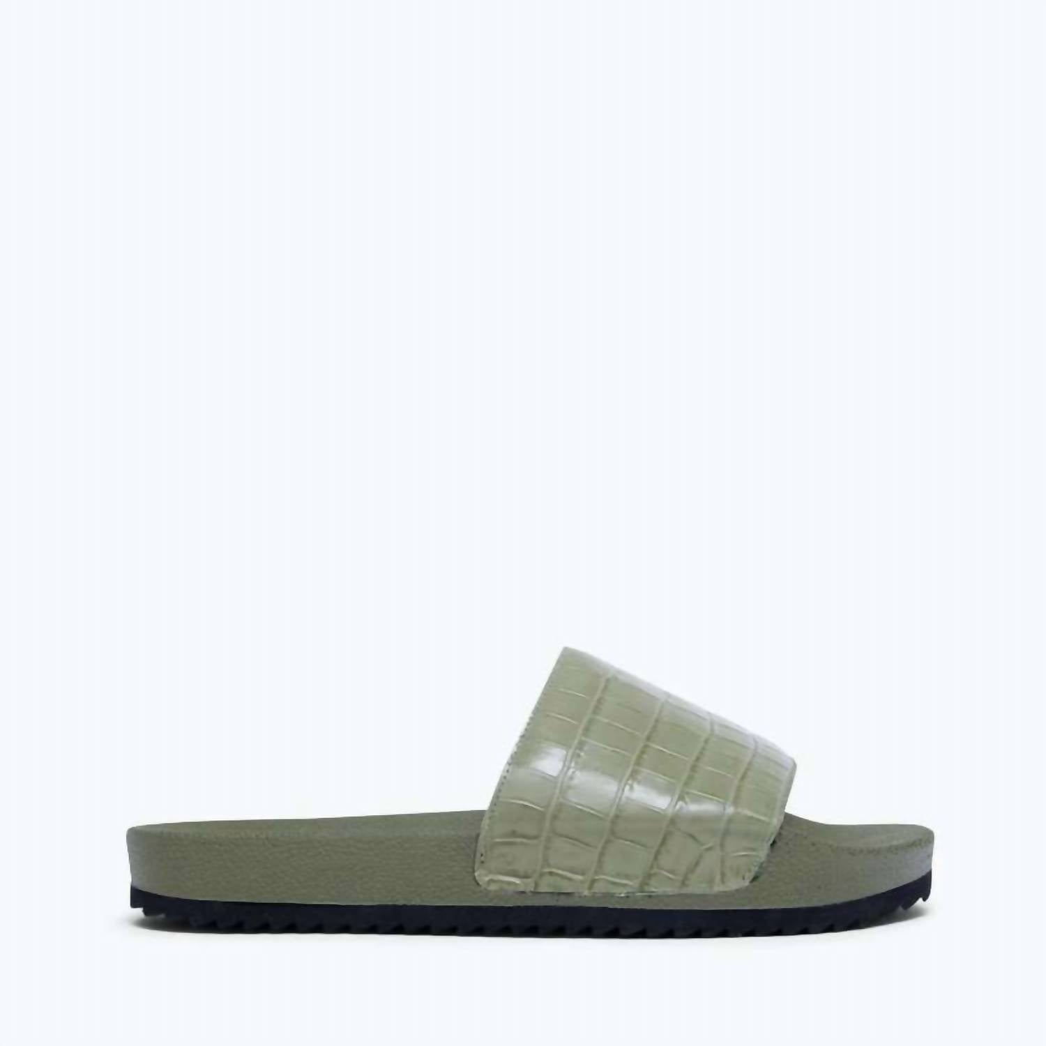 Eleve seu guarda-roupa de verão com os Chinelos Femininos Lea da FREDA SALVADOR, confeccionados em couro 100% italiano com estampa de crocodilo em relevo de eucalipto. Estas sandálias slip-on possuem palmilha leve moldada e solado de borracha resistente à água, proporcionando estilo e funcionalidade. O forro em couro macio garante conforto o dia todo, tornando-os perfeitos para as tendências do streetwear. Com salto plano de 2,5 cm e bico aberto, estes chinelos são ideais para mulheres que buscam elegância sem esforço.