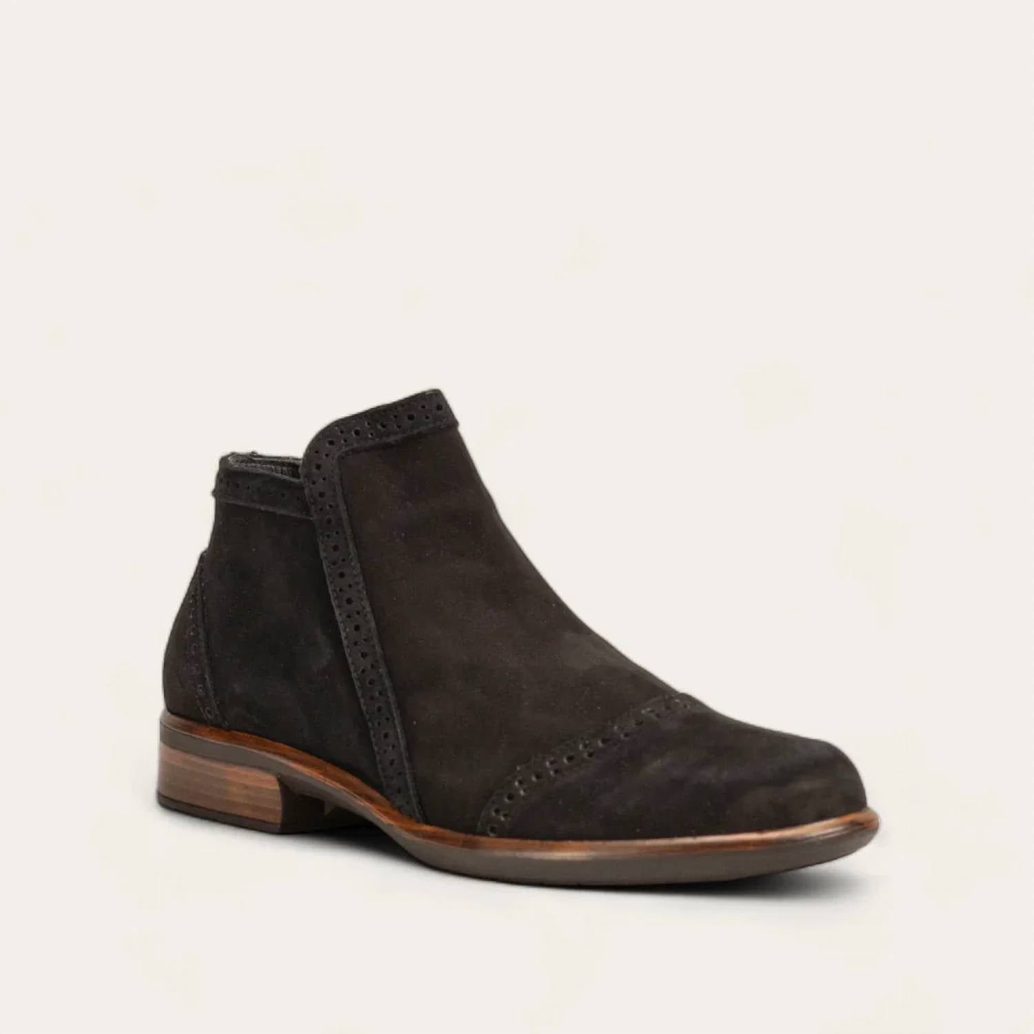 Confeccionadas em couro premium, estas botas estilosas apresentam bico redondo e salto bloco com uma altura confortável de 3,8 cm. Com foco no conforto personalizado, elas vêm com palmilha anatômica removível de cortiça e látex da Naot e são adequadas para órteses. Oferecem suporte leve e durável graças ao solado de poliuretano de 3,8 cm com haste de metal e design antiderrapante. Oferecem extrema flexibilidade com a construção Strobel costurada à mão. Forma pequena; recomenda-se um número maior para meias-calças.