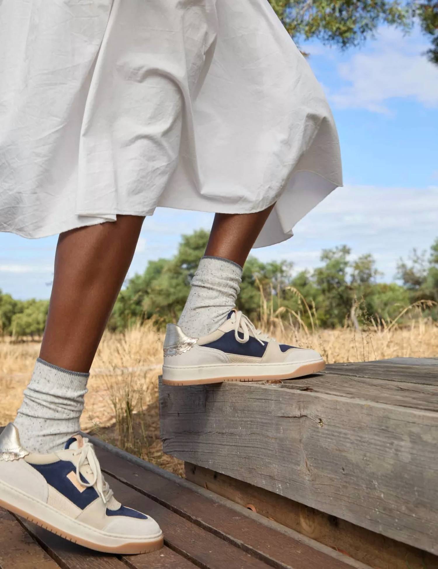 Estilosos, confortáveis ​​e com suporte. Estes tênis esportivos atendem a todos os requisitos. Apresentamos o Tênis Feminino em Couro Pintado da PENELOPE CHILVERS, uma mistura perfeita de elegância e conforto, ideal tanto para o dia a dia quanto para passeios noturnos. Confeccionado em couro premium, este tênis apresenta um sofisticado design de bico redondo. Com o exclusivo detalhe em couro recortado no calcanhar, ele traz um toque único de elegância a qualquer look de outono. Disponível em um elegante azul-marinho, é a sua escolha ideal para viagens ou eventos de Ação de Graças.