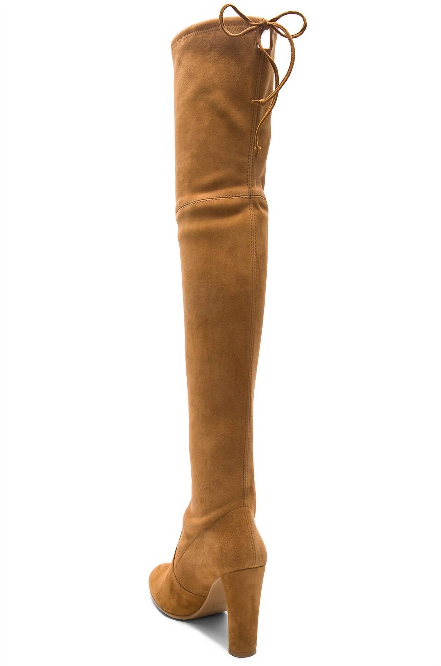 Descubra as botas Highland Over the Knee USADAS da Stuart Weitzman, um salto agulha de inspiração vintage, criado para estilo e sofisticação. Estas botas de camurça camelo apresentam um cabedal luxuoso em camurça com sola de borracha, enquanto o fecho de amarrar oferece um ajuste personalizável. Feitas com maestria na Espanha, as botas ostentam bico redondo e um salto impressionante de 9 cm (4 polegadas), complementado por um cano de 56 cm (22 polegadas). Abrace a elegância desta peça essencial da alta costura, projetada para a mulher exigente. Condição: Excelente.
