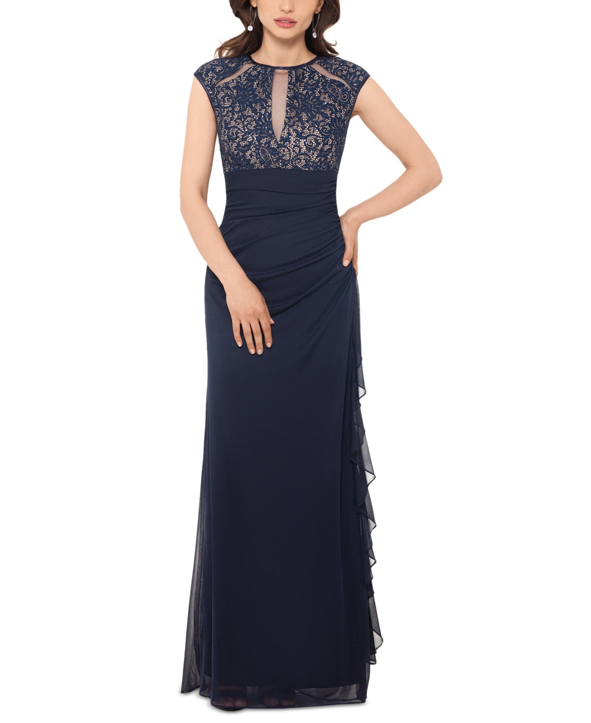 Gola redonda; Silhueta de vestido | Forrado | Importado | Corpete de renda; franzido na lateral | Fecho de zíper nas costas | Vestido formal longo | Fale com um estilista e receba aconselhamento especializado gratuito online ou em lojas para o seu guarda-roupa