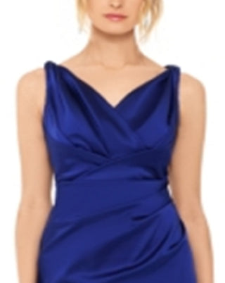 Vestido feminino Betsy & Adam, de cetim, com decote em V e franzido, azul, tamanho 8