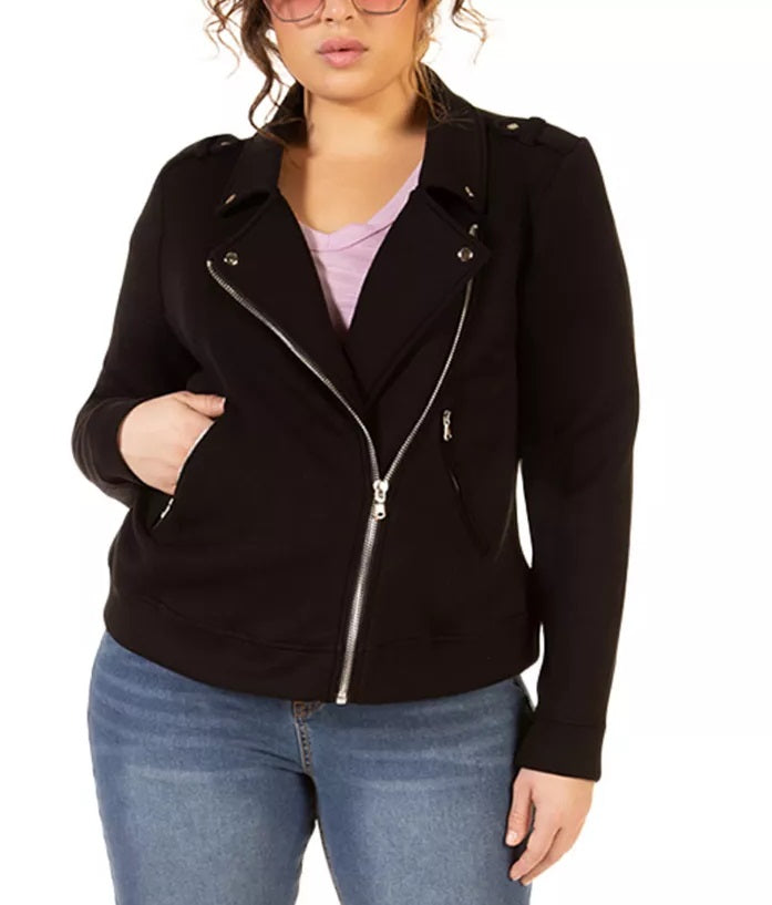Liberte a motociclista que existe em você com esta jaqueta motociclista plus size da Black Tape | em malha elástica confortável com zíper frontal assimétrico e painéis modeladores em cada lado. | Comprimento aproximado; 25-1/2 | Gola entalhada com botões de pressão; fecho de zíper frontal assimétrico | Encaixe canelado na manga; painéis modelados nas laterais | Dois bolsos na frente
