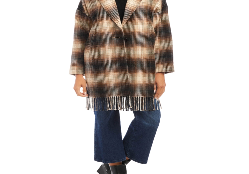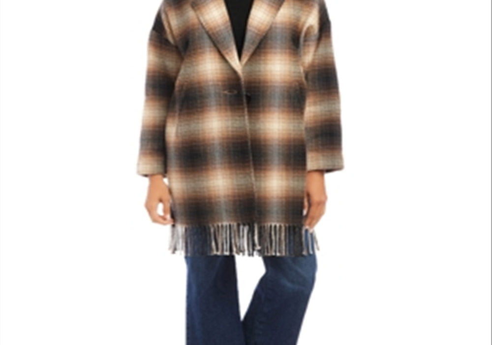 Jaqueta Karen Kane Plaid Fringe Trim | Cor; Marrom | Tamanho; XS | Material; 45% acrílico/30% poliéster/20% lã/5% outras fibras; forro; 100% poliéster | Jaquetas
