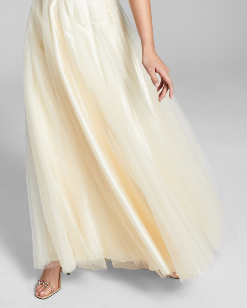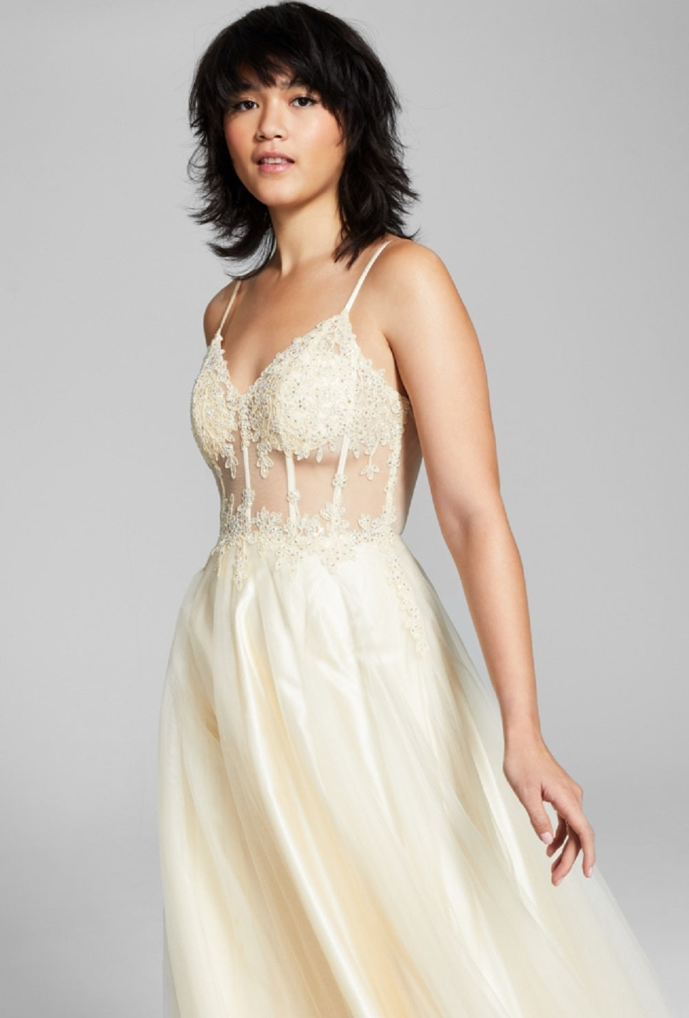Tecido de malha | Decote em V; Silhueta de vestido | Fecho de zíper nas costas | Vestido formal longo | Corpete adornado com detalhes de transparência | Forrado | Importado