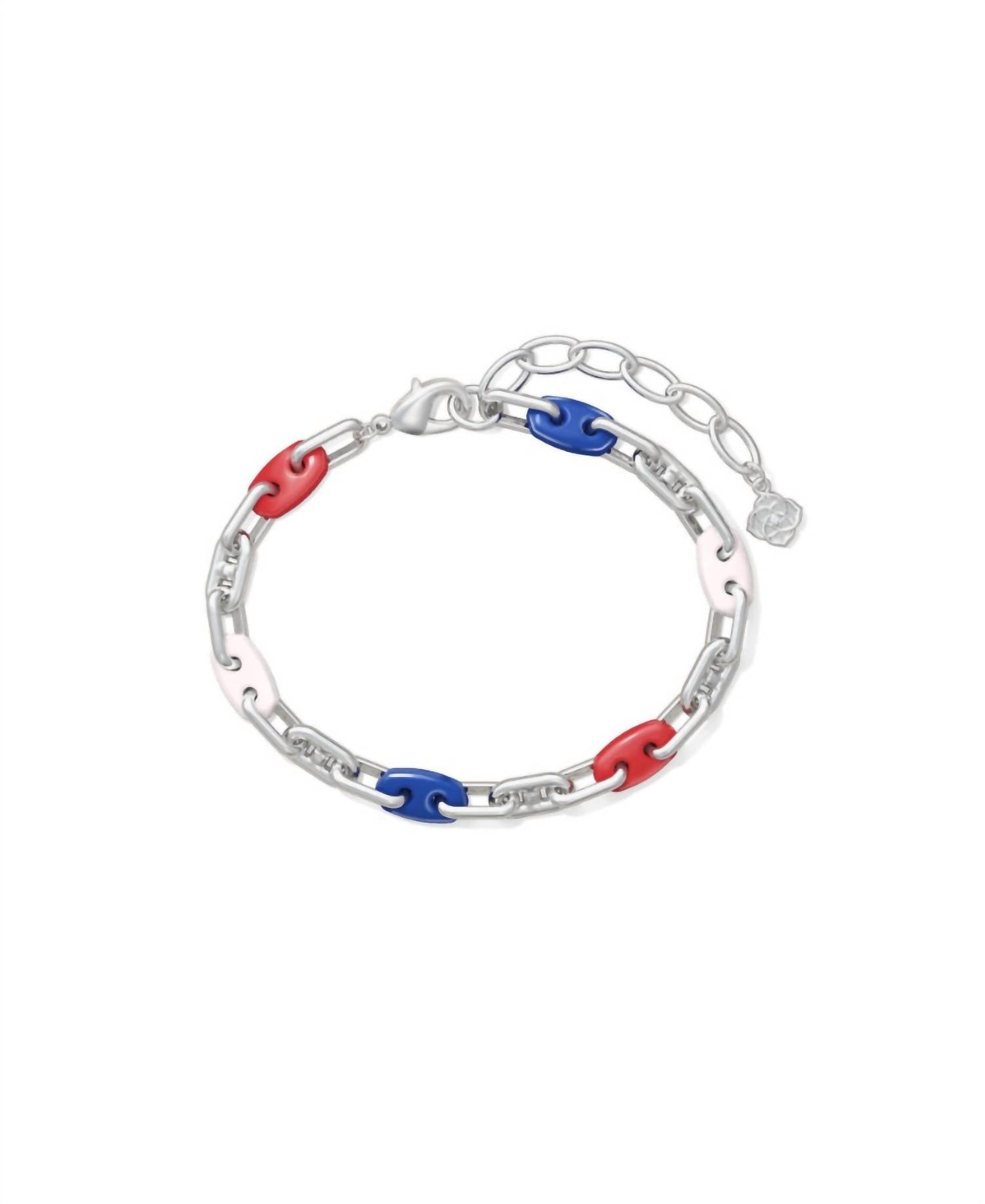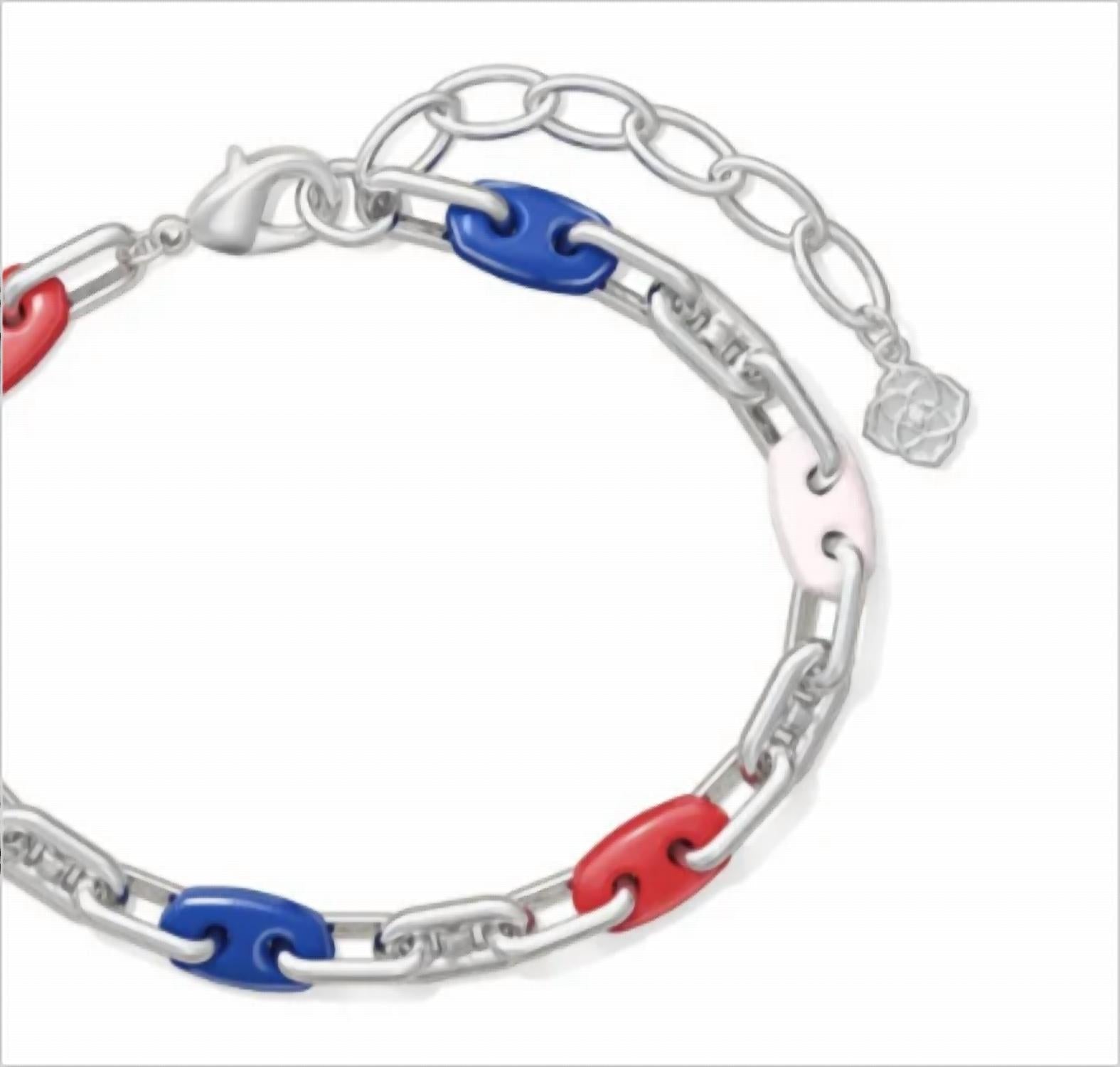 Empilhadas ou sozinhas, você não vai errar com esta pulseira. Adicione um toque patriótico ao seu look com a Pulseira Feminina Bailey Chain da Kendra Scott em Prata, Vermelho, Branco e Azul. Esta charmosa pulseira fashion apresenta uma delicada corrente prateada complementada por uma divertida mistura de cores, tornando-a um acessório ideal para qualquer ocasião. Confeccionada com banho de prata, ela personifica a qualidade e o estilo pelos quais Kendra Scott é reconhecida.