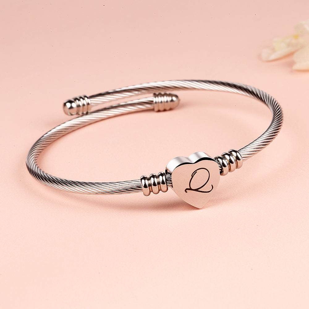 O pingente inicial é feito de aço inoxidável de alta qualidade, com acabamento polido que acrescenta beleza e brilho. O pingente em forma de coração também é feito de aço inoxidável e apresenta um design de cabo trançado que complementa o design geral da pulseira.