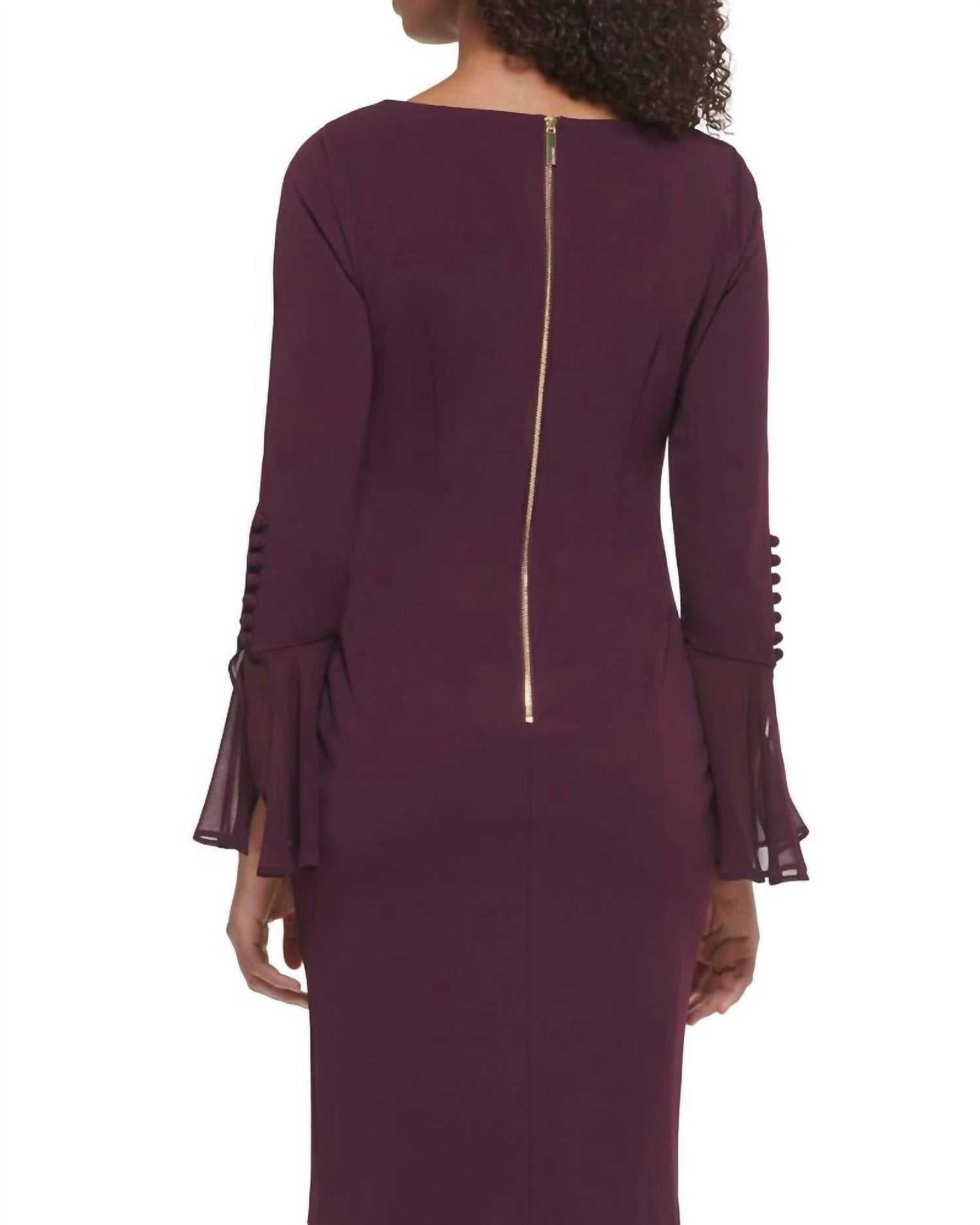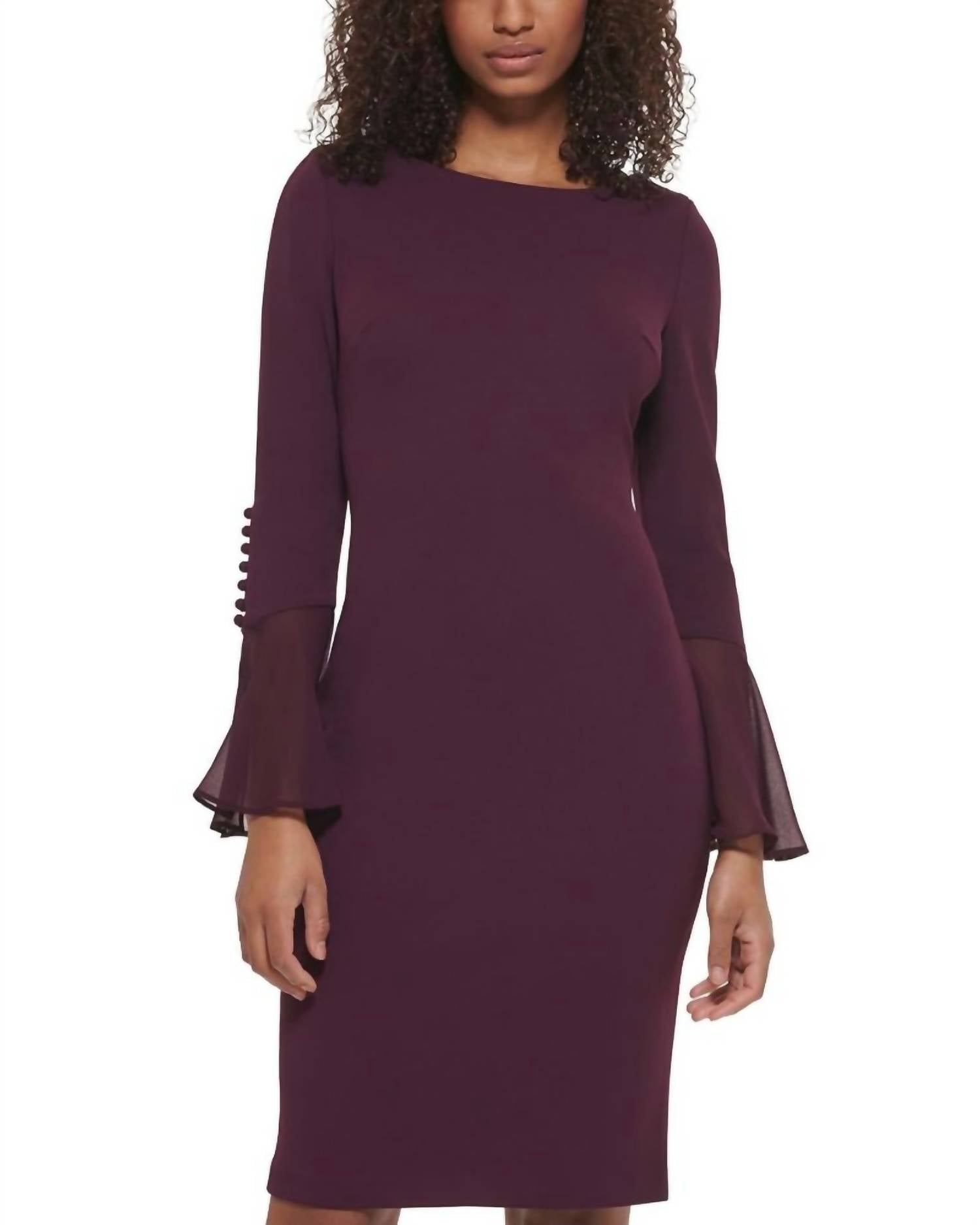 Vestido tubinho de crepe Scuba com mangas tulipa, decote redondo, mangas curtas, fecho de zíper nas costas e bainha reta. Lavagem a seco somente.