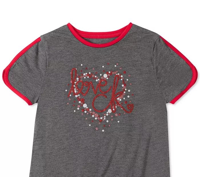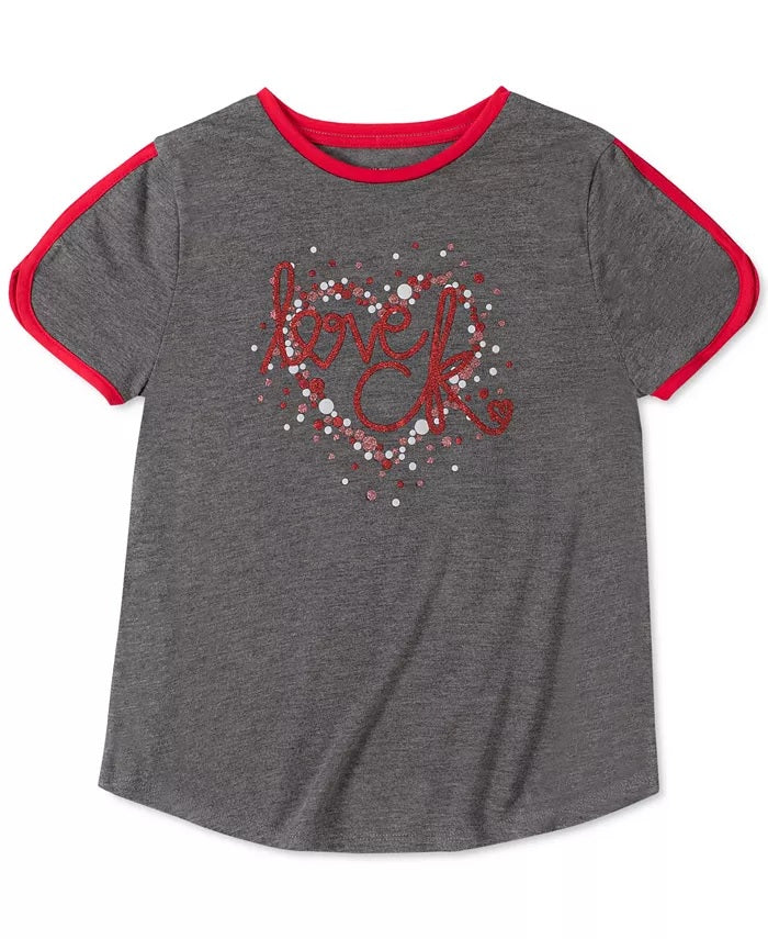 Gola redonda | Estampa frontal com glitter 'love ck' | Mangas curtas estilo golfinho | Rayon/poliéster | Lavável à máquina | Importado
