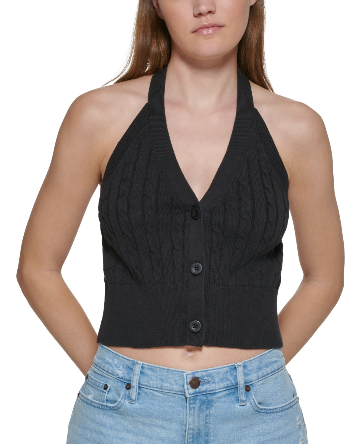 A Calvin Klein Jeans leva o tricô clássico a um novo patamar de elegância com esta blusa de algodão estilo tomara que caia. | Decote em V | 100% algodão | Lavável à máquina | Importado