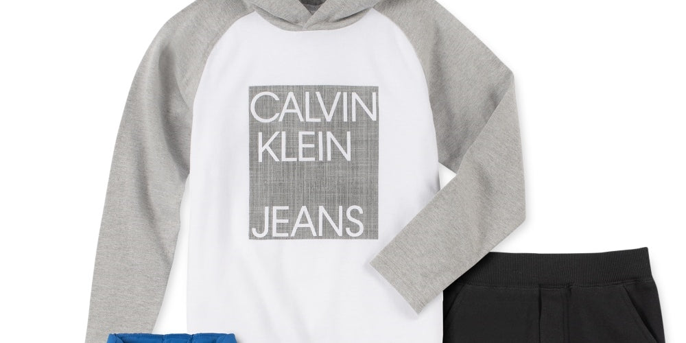 Colete: acolchoado; bolsos laterais; fecho de zíper; remendo de borracha CK no peito esquerdo; atinge a cintura | Moletom com capuz: corpo branco, mangas e capuz cinza; logotipo CK no peito; atinge a cintura | Calça: bolsos; cós elástico; logotipo CK na perna esquerda; atinge os tornozelos | Colete: poliéster; moletom com capuz: algodão/poliéster; calças: algodão/poliéster | Lavável à máquina | Importado