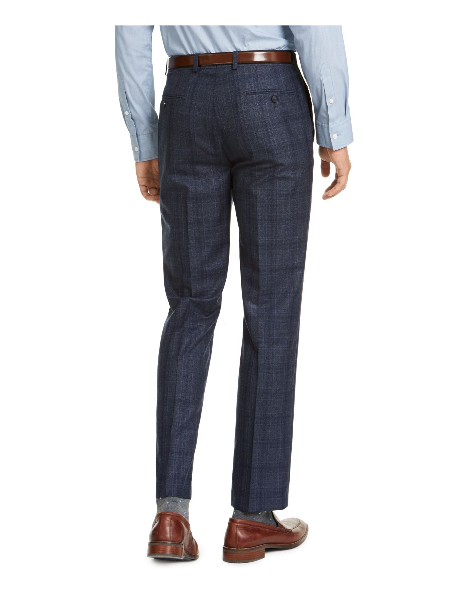 calvin klein|estilo; calças|ocasião; trabalho|tamanho; 34l x 34c|material; mistura de lã|cor; azul|xadrez de janela