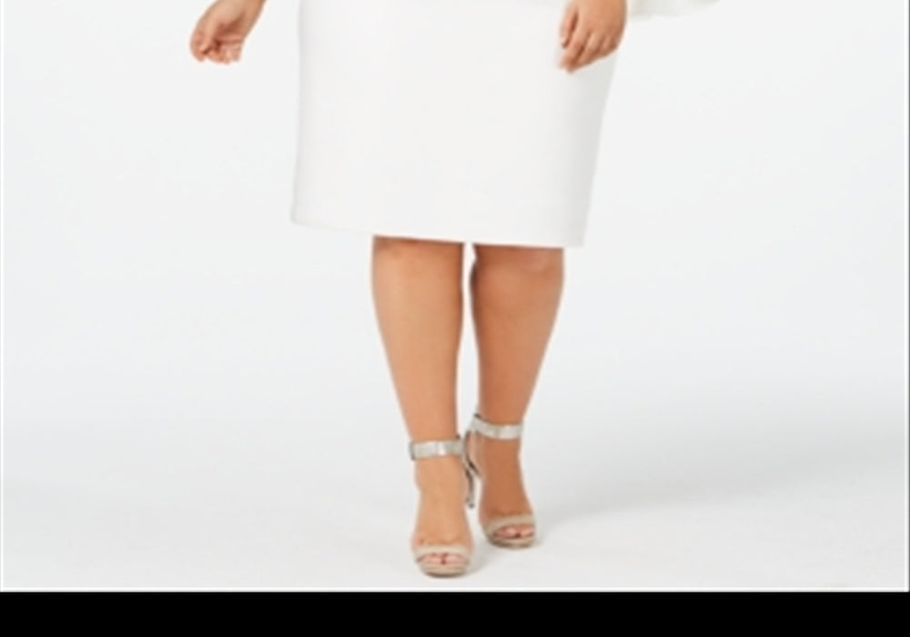 Faça uma pose glamourosa com o vestido plus size da Calvin Klein, que valoriza o corpo, com ombros expostos e mangas sino dramáticas