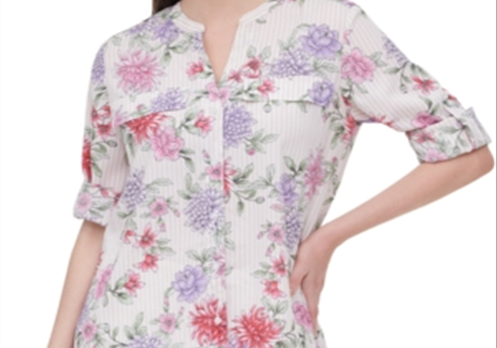 Uma silhueta sofisticada que permite arregaçar as mangas para uma sensação mais casual | esta blusa Calvin Klein apresenta o visual fresco de uma estampa floral tonal |