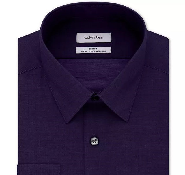 Camisa social masculina Calvin Klein Steel Slim Fit, sem passar roupa, com gola espinha de peixe, roxa, tamanho 16x34-35
