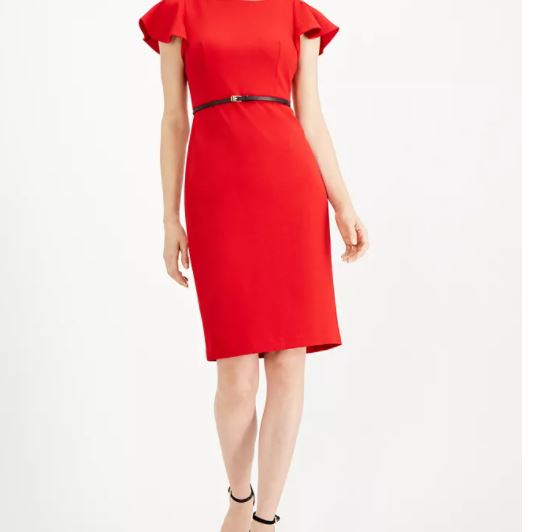 Aproximadamente 99 cm de comprimento, do centro do pescoço até a bainha. O comprimento é baseado no tamanho 4 e varia 6 mm entre os tamanhos. | Decote canoa; modelagem justa | Fecho de zíper dourado nas costas | Cinto de couro sintético; mangas com babados | Sem forro | Poliéster/elastano | Lavagem a seco