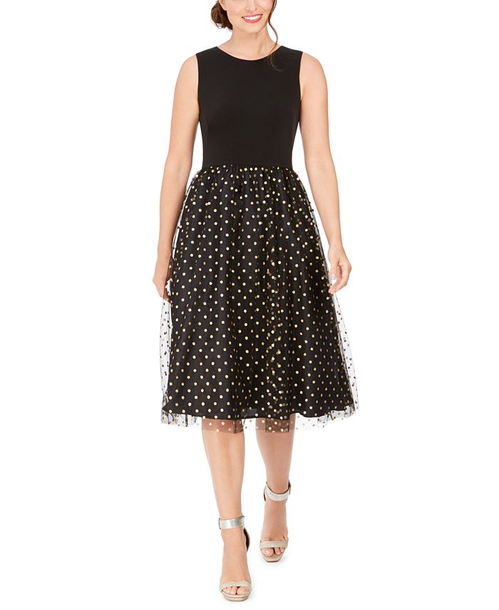 Decote redondo; Silhueta ajustada e evasê | Fecho de zíper nas costas | Poliéster