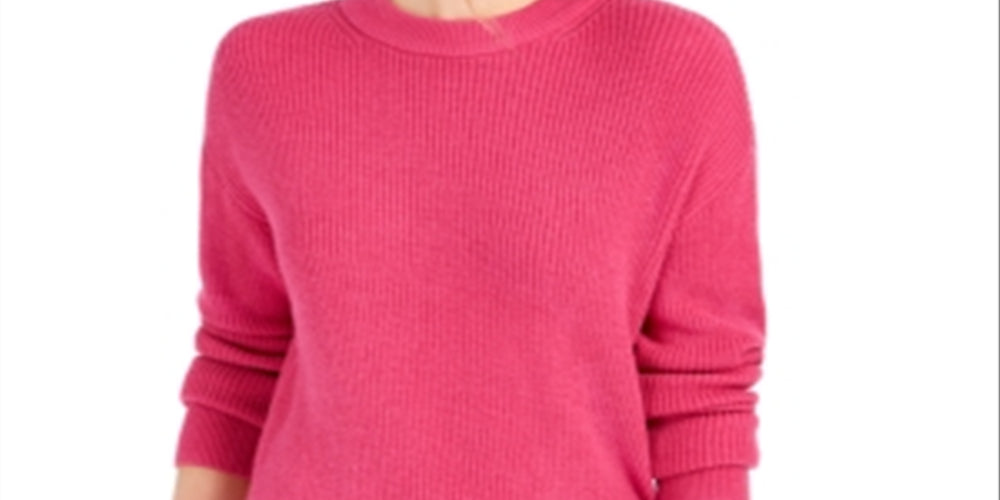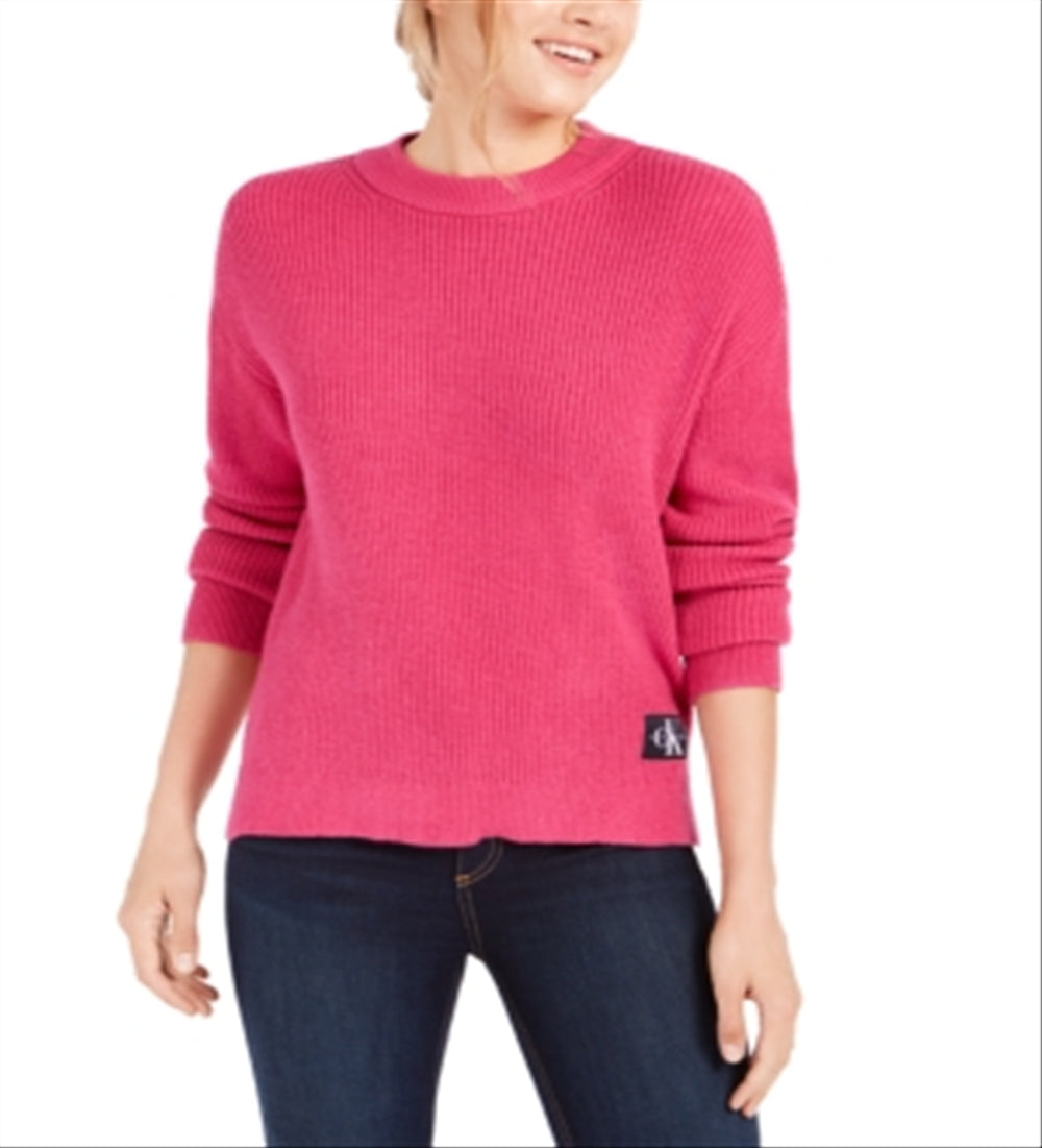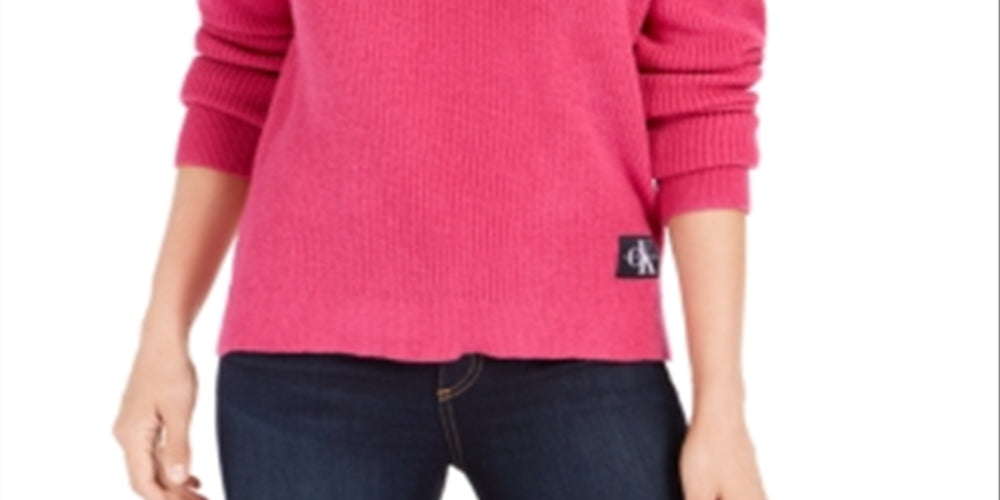 Suéter feminino Calvin Klein Jeans rosa escuro com gola alta e manga comprida. Tamanho XS | Novo com etiquetas. 52% Viscose | 28% Poliéster | 20% Nylon. De axila a axila, aprox. 53 cm de comprimento (do ombro à bainha traseira), aprox. 61 cm. 004492-72