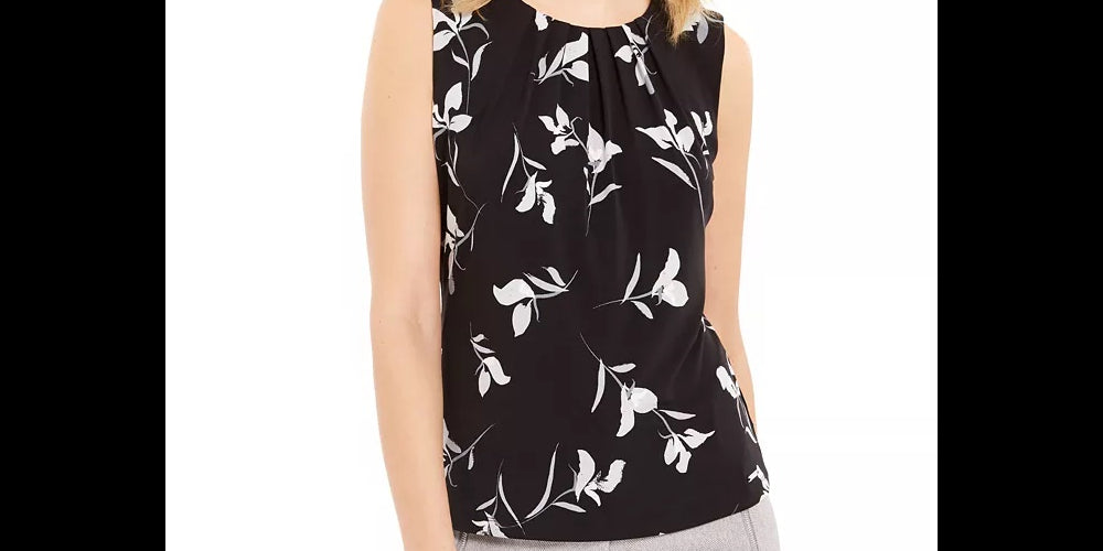 Blusa feminina Calvin Klein com estampa floral e gola plissada, sem mangas, preta/branca, tamanho X-G