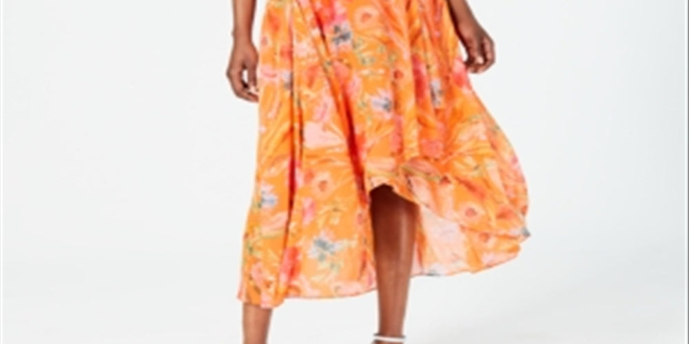 Vestido longo Calvin Klein feminino com estampa floral, comprimento longo e decotado, laranja, tamanho 8
