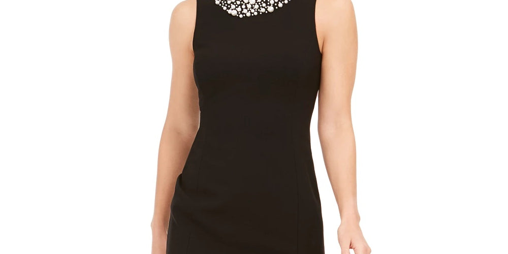 Aproximadamente 89 cm de comprimento, do centro da gola até a bainha. O comprimento varia 1,2 cm entre os tamanhos. | Projetado para se ajustar e valorizar pessoas de 1,62 m ou menos. | Decote redondo com detalhes em pérolas artificiais; modelagem justa. | Zíper traseiro oculto com fecho de colchete. | Poliéster/rayon/elastano; forro: poliéster. | Lavagem a seco. | Importado.