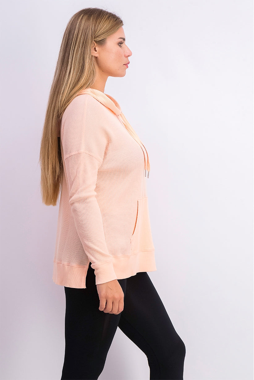 Bainha alta e baixa para maior cobertura | INSPIRADO PARA: Athleisure | Malha waffle | Capuz com cordão; mangas compridas com ombros caídos; bolso canguru | Algodão/poliéster | Lavável à máquina
